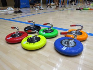 の体育館をお借りしてカローリングのコートを2面作り、子ども達と学生ボランティアにもチームを作って